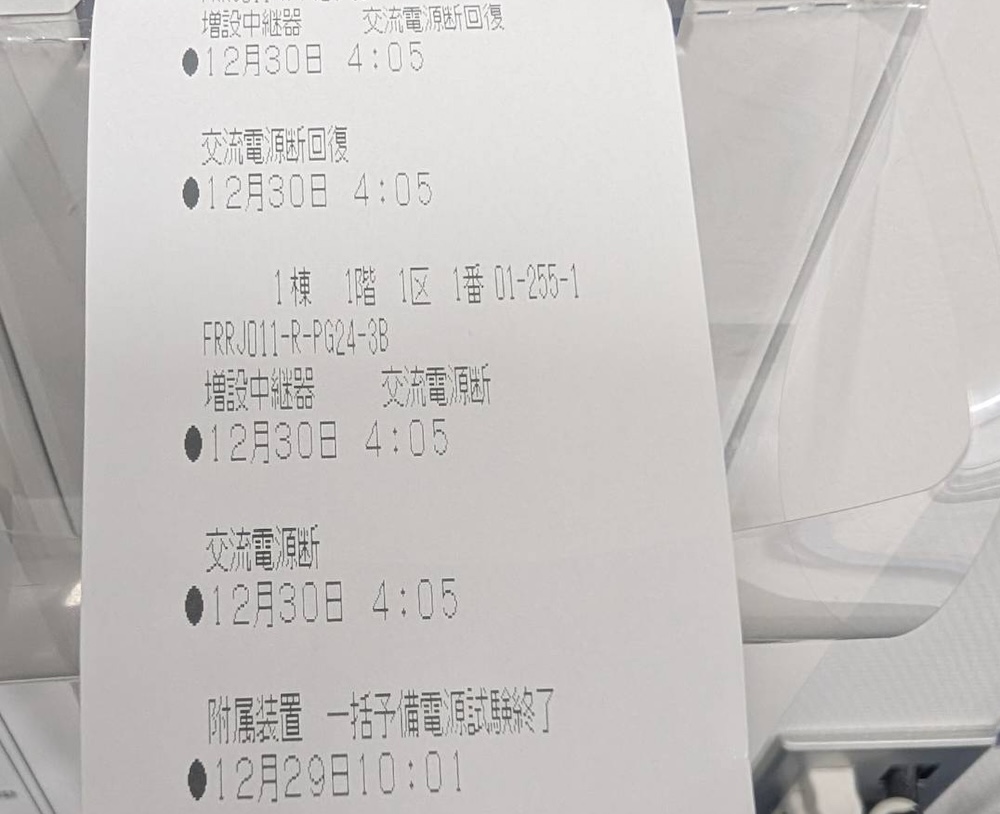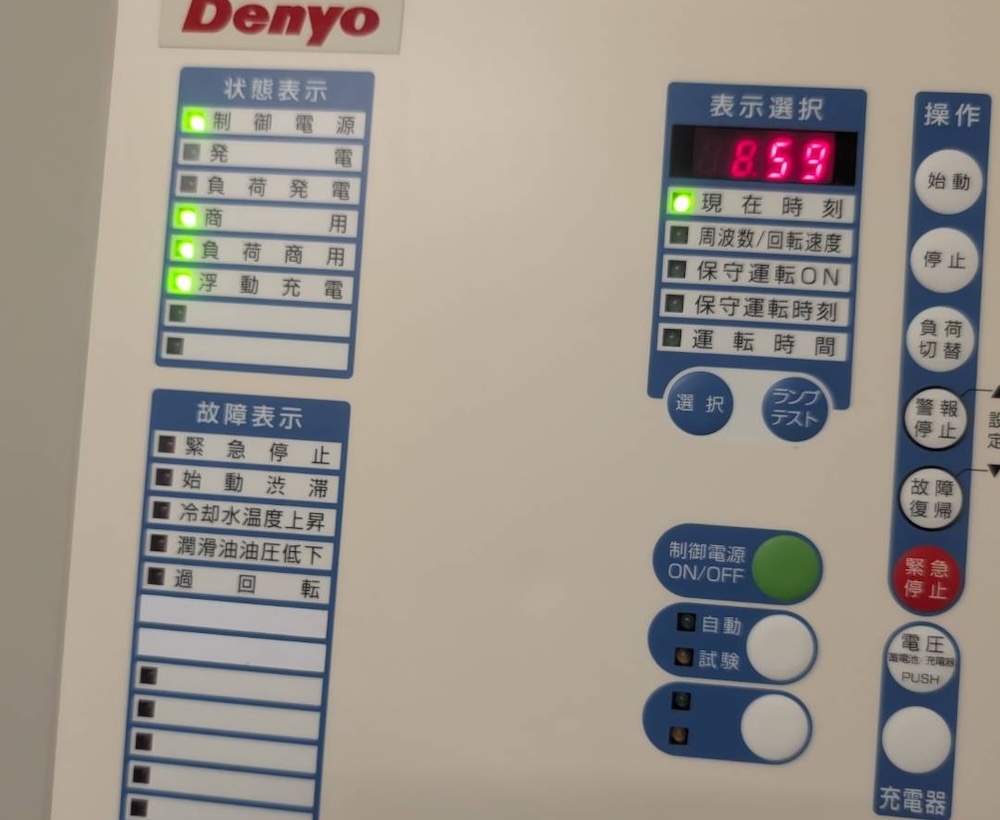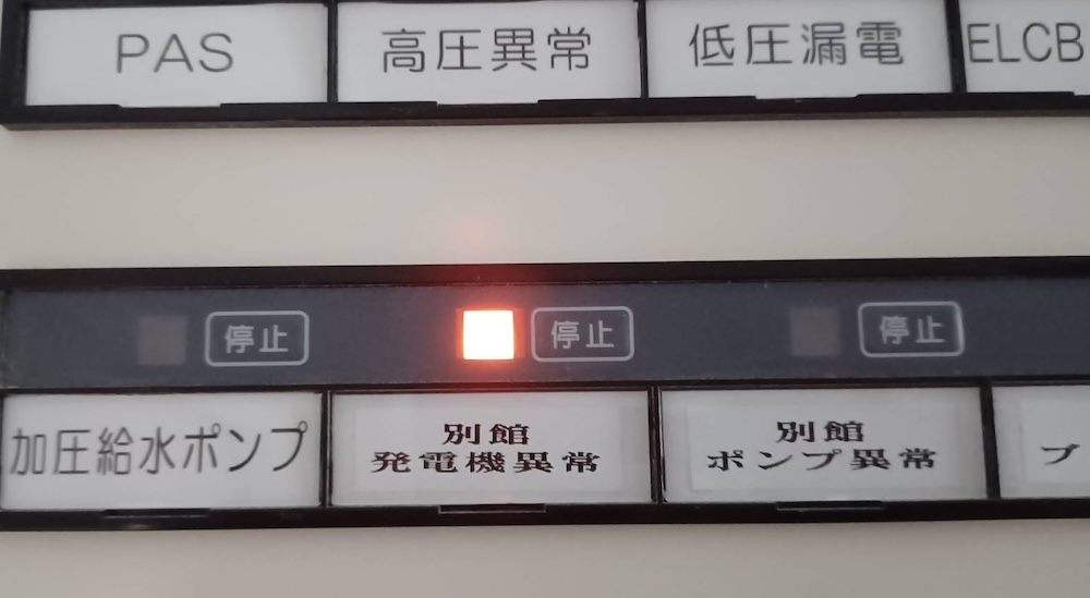 「警報の時間を確認したところ、1時32分頃、瞬時停電が、発生し、すぐに復電しております。このとき、発電機が、停電を検知して、動作しようとしましたが、復電を検知したため、始動渋滞の故障とて、自動→手動に切り替えられたと、思います。4時3分から1分停電していますが、このとき発電機は、手動のため、発電動作しなかったと推測します。」