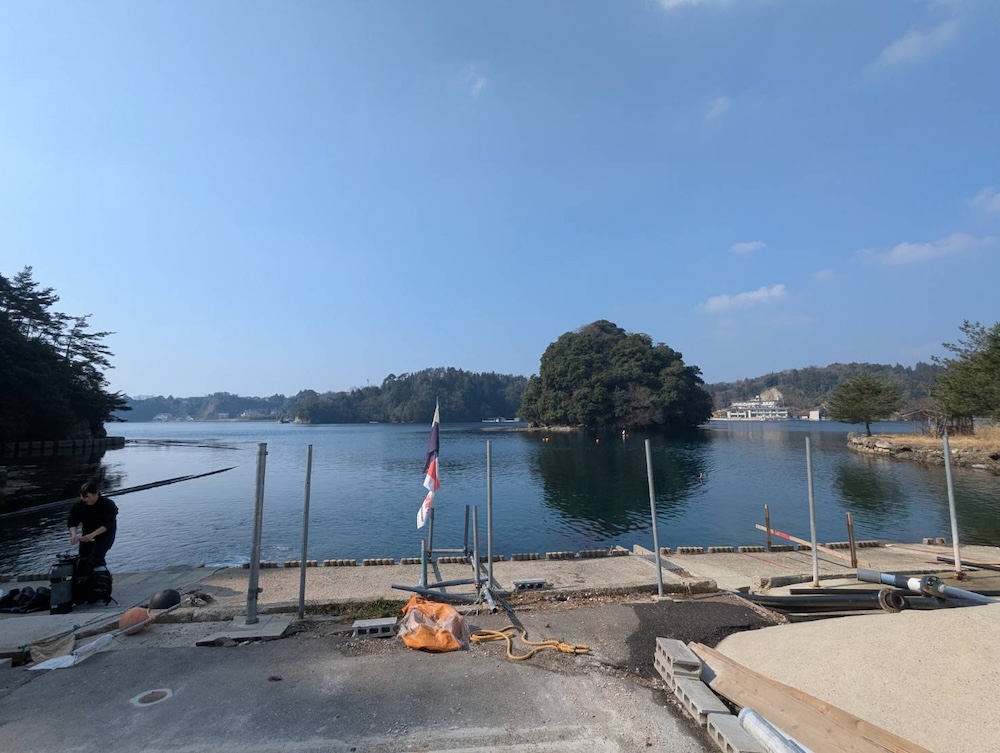 臨海実験施設小木曽技官、鷹巣技術補佐員に、朝から潜水していただき、管の重石をとっていただきました。